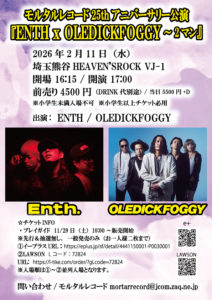 2026.02.11 (wed) 熊谷HEAVEN'SROCK VJ-1 モルタルレコード25thアニバーサリー公演 『ENTH x OLEDICKFOGGY~2マン』 OPEN 16:15 / START 17:00ACTw/ OLEDICKFOGGYTicket InformationADV. ¥4,500 / DOOR. TBA一般発売発売日: 2025.11.29Information SHARE: